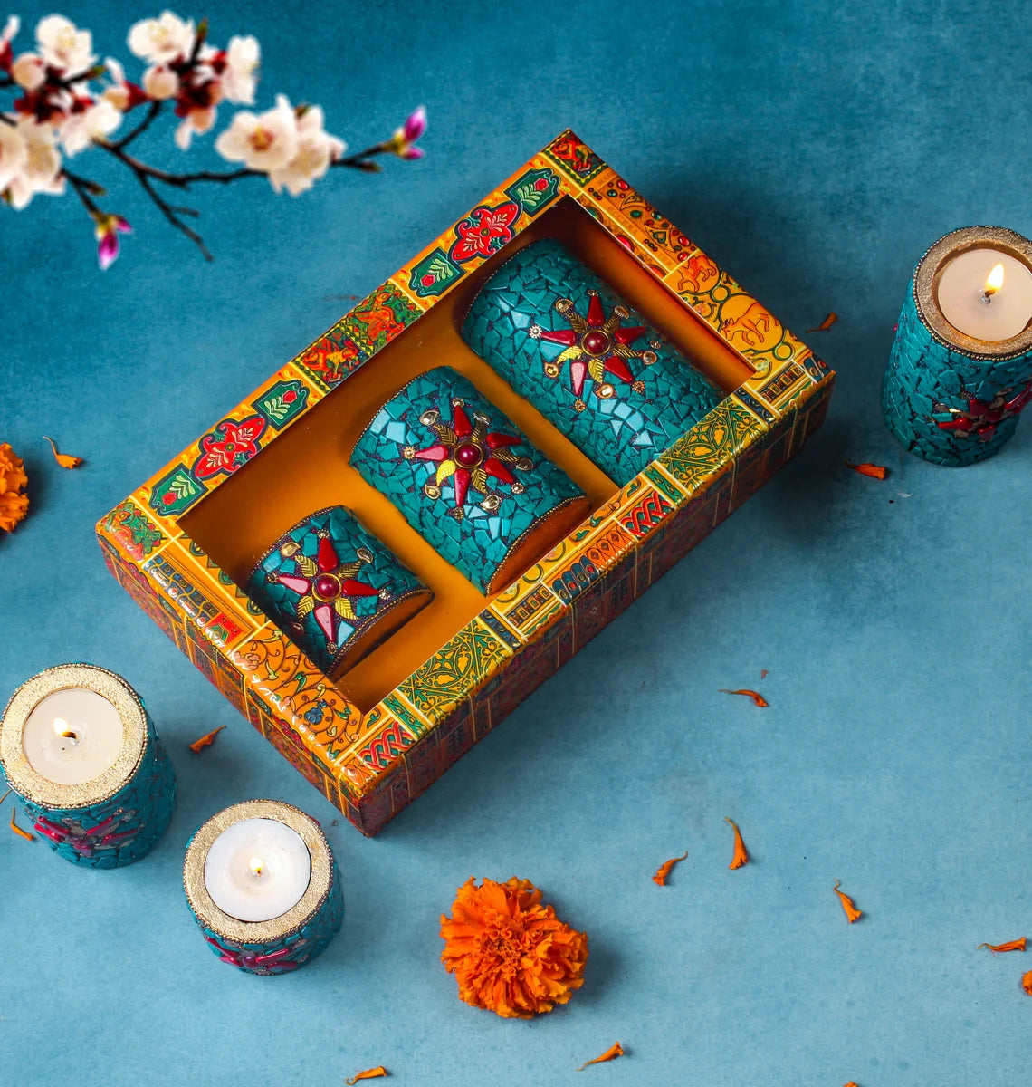 This set of three wooden tea light candle holders adds a warm and inviting touch to any home. The Green color adds a festive touch and the natural wood grain provides a rustic charm. These candle holders are perfect for creating a relaxing ambiance or for adding a decorative touch to a table or shelf.